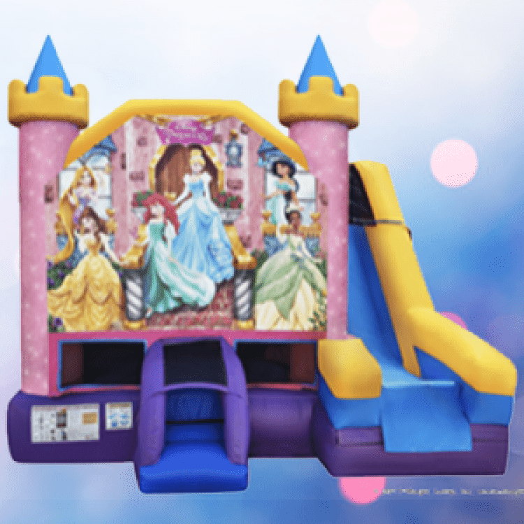 Transform any party into a Magical Celebration with your favorite Disney Princesses with Bruno's Bounce House Official DISNEY PRINCESS 5-in-1 Combo unit. This Dry combo ride features five different inflatable activities: (1)a basketball hoop (2) a bigger bouncing area (3) inflated push-through, obstacle pop-ups (4) a wall climber (5) a “high platform” dry slide.