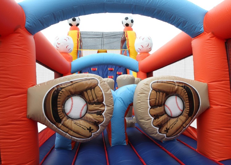 Introducing Bruno's Bounce House exhilarating 60' Sports Course Obstacle Course! Designed specifically for thrill-seekers of all ages, this dynamic inflatable features an array of sports-themed obstacles and popups that will keep participants engaged and entertained. Starting with double crawl-throughs, the adventure continues as racers face off against two formidable linebackers, navigates through baseball gloves ready to catch them, and maneuver past a series of baseball bat popups. The excitement culminates with an exhilarating 11-foot climb leading into dual slides, guaranteeing an unforgettable experience!