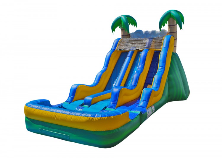 Experience the ultimate summer adventure with Bruno's Bounce House's exhilarating 17' tall Tropical Dual Lane Water Slide. Beat the heat and make unforgettable memories as you and your friends race down this thrilling slide. Perfect for tropical or Hawaiian-themed parties, our Dual Lane Water Slide adds a splash of excitement. Climb up to the top, choose one of the two lanes, and slide down under the refreshing water misting system, culminating in a refreshing splash into the pool. This incredible slide is suitable for individuals aged 8 and up, including adults. Please note that the Garden Water Hose required to connect to the slide is not included. Get ready for an unforgettable summer experience at Bruno's Bounce House!